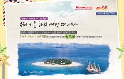 오는 31일까지 진행되는 이번 이벤트는 전국 128개의 홈플러스 매장에서 동시 진행되고 있으며, 홈플러스 구매자가 응모할 수 있다. 추첨을 통해 당첨된 1등에겐 6박 7일 동안 피지의 섬을 통째로 빌릴 수 있는 3000만 원 상당의 4인 가족 여행권이 제공된다. 이외에도 2등 4인 가족 1팀과, 3등 2인 가족 5팀에게 4박 5일 동안 피지 리조트 여행을 즐길 수 있는 기회가 주어진다.