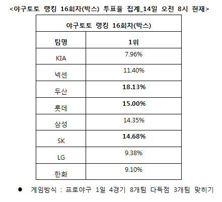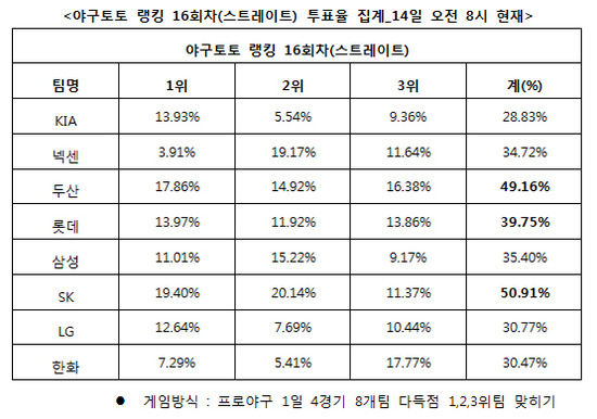 2012 프로야구 대상 야구토토 랭킹 16회차 투표율 중간집계 결과