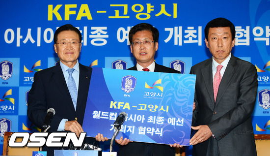 이 자리에는 조중연 회장과 최성 고양시장, 그리고 최강희 국가대표팀 감독이 참석한 가운데 오는 6월 12일 예정된 2014브라질월드컵 아시아 최종예선 2차전 레바논전을 고양시에서 개최하기로 합의하고 양해각서(MOU)를 체결했다./ rumi@osen.co.kr
