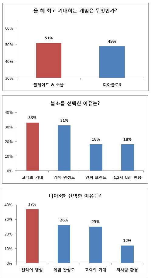 특히 블소는 ‘고객의 기대가 크기 때문’이라는 이유가 33%으로 가장 높으며, 디아3는 ‘전작의 명성’이 37%로 가장 높은 요소로 집계됐다.