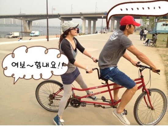 사진 속 김보민, 김남일 부부는 한강변에서 나란히 2인용 자전거를 타고 있는 모습이다. 사진 속에 말풍선을 삽입해 "여보 힘내요!"라는 글을 적어 넣은 김보민의 센스가 돋보인다.
