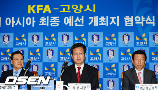 이 자리에는 조중연 회장과 최성 고양시장, 그리고 최강희 국가대표팀 감독이 참석한 가운데 오는 6월 12일 예정된 2014브라질월드컵 아시아 최종예선 2차전 레바논전을 고양시에서 개최하기로 합의하고 양해각서(MOU)를 체결했다./ rumi@osen.co.kr