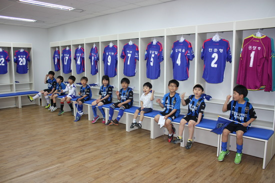 지난 5일 투어에 참가한 어린이 팬이 라커룸에서 기념촬영을 갖고 있다 / 인천 유나이티드 제공.