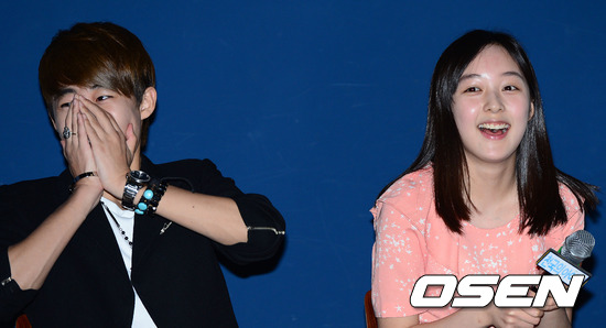 박지빈과 김보라가 간담회 도중 즐거워하고 있다.