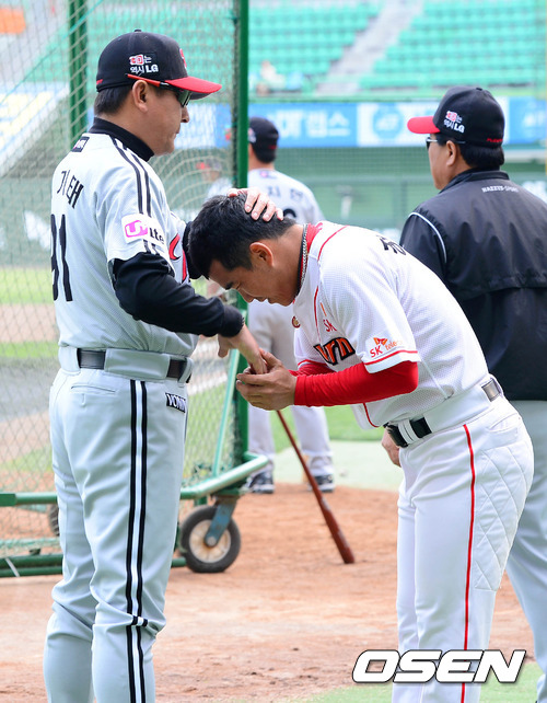 15일 오후 인천야구장에서 열린 '2012 팔도 프로야구' SK 와이번스와 LG 트윈스와의 경기에 앞서 SK 정근우가 LG 김기태 감독에게 인사를 하고 있다.
