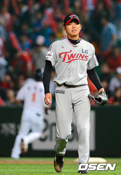 15일 오후 인천야구장에서 열린 '2012 팔도 프로야구' SK 와이번스와 LG 트윈스와의 경기, 5회말 2사 1루 LG 임정우가 SK 박재상을 내야땅볼로 처리하고 더그아웃으로 가고 있다.