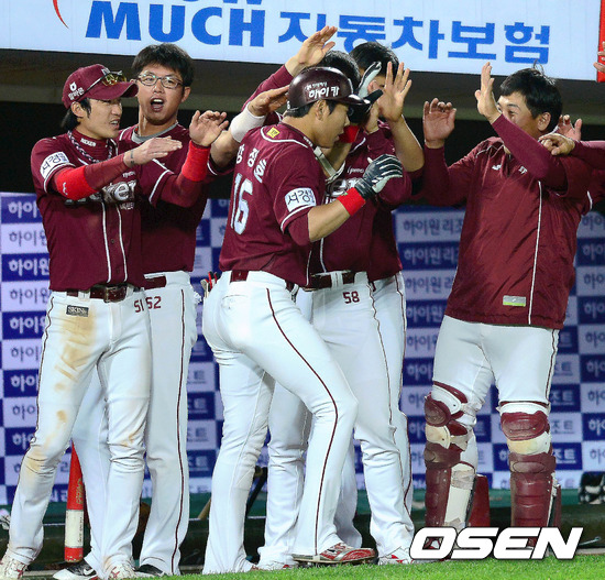 15일 부산 사직구장에서 열린 '2012 팔도 프로야구' 롯데 자이언츠와 넥센 히어로즈의 경기 5회초 1사 1루 넥센 강정호가 투런 홈런을 치고 동료들의 환영을 받고 있다.