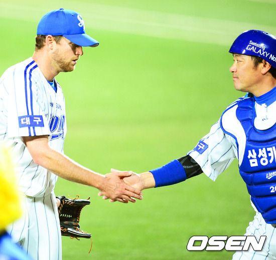 15일 오후 대구구장에서 열린 '2012 팔도 프로야구' 삼성 라이온즈와 KIA 타이거즈의 경기에서 4회초를 마무리한 후 삼성 선발 탈보트가 진갑용과 악수를 하고 있다.