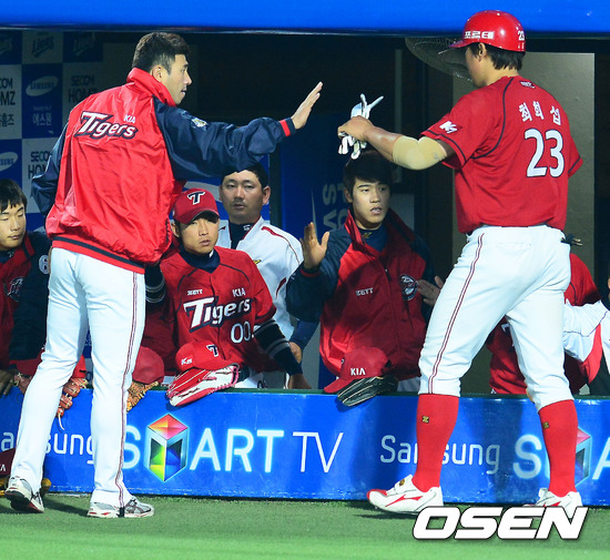15일 오후 대구구장에서 열린 '2012 팔도 프로야구' 삼성 라이온즈와 KIA 타이거즈의 경기에서 4회초 2사 주자 1,3루 KIA 김상훈 타석에서 삼성 선발 탈보트의 와일드피칭때 홈을 밟은 최희섭이 덕아웃에서 서재응과 하이파이브를 하고 있다.