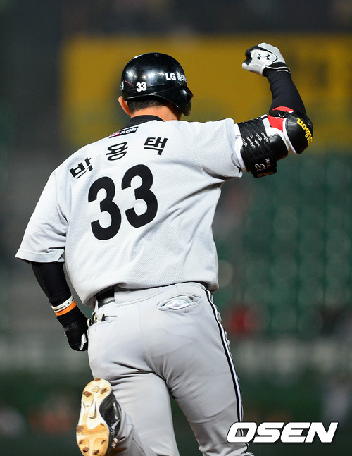 15일 오후 인천야구장에서 열린 '2012 팔도 프로야구' SK 와이번스와 LG 트윈스와의 경기, 8회초 무사 1루 LG 박용택이 역전 우월 투런 홈런을 치고 환호하고 있다.