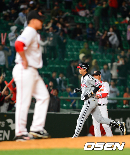 15일 오후 인천야구장에서 열린 '2012 팔도 프로야구' SK 와이번스와 LG 트윈스와의 경기, 8회초 무사 1루 LG 박용택이 역전 우월 투런 홈런을 치고 그라운드를 돌고 있다.
