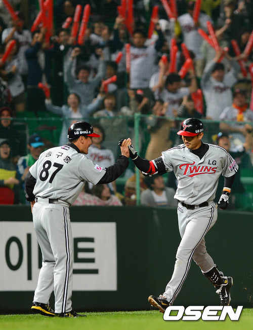 15일 오후 인천야구장에서 열린 '2012 팔도 프로야구' SK 와이번스와 LG 트윈스와의 경기, 8회초 무사 1루 LG 박용택이 역전 우월 투런 홈런을 치고 송구홍 코치와 하이파이브를 하고 있다.