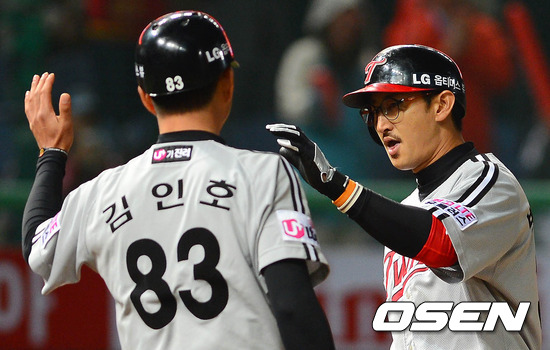 15일 오후 인천야구장에서 열린 '2012 팔도 프로야구' SK 와이번스와 LG 트윈스와의 경기, 8회초 무사 1루 LG 박용택이 역전 우월 투런 홈런을 치고 홈에서 김인호 코치와 하이파이브를 하고 있다.