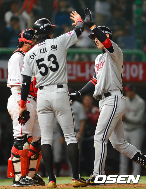 15일 오후 인천야구장에서 열린 '2012 팔도 프로야구' SK 와이번스와 LG 트윈스와의 경기, 8회초 무사 1루 LG 박용택이 역전 우월 투런 홈런을 치고 홈을 밟은 1루주자 이대형과 하이파이브를 하고 있다.