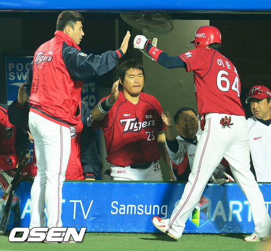15일 오후 대구구장에서 열린 '2012 팔도 프로야구' 삼성 라이온즈와 KIA 타이거즈의 경기에서 7회초 1사 주자 1,3루 KIA 이용규의 유격수 왼쪽 내야 1타점 적시타때 홈을 밟은 이준호가 덕아웃에서 서재응, 최희섭과 하이파이브를 하고 있다.
