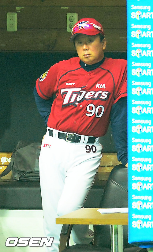 15일 오후 대구구장에서 열린 '2012 팔도 프로야구' 삼성 라이온즈와 KIA 타이거즈의 경기에서 7회초 KIA 덕아웃에서 KIA 선동렬 감독이 경기를 주시하고 있다.