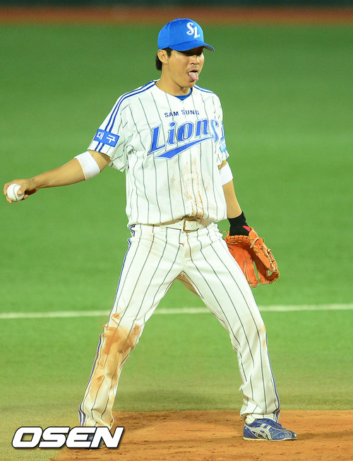 15일 오후 대구구장에서 열린 '2012 팔도 프로야구' 삼성 라이온즈와 KIA 타이거즈의 경기에서 7회초 2사 주자 1,2루 KIA 안치홍의 유격수 왼쪽 내야안타때 공을 잡은 삼성 2루수 신명철이 만루가 되어 던질 곳이 없자 혀를 내밀고 있다.