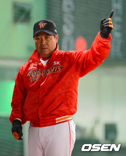 15일 오후 인천야구장에서 열린 '2012 팔도 프로야구' SK 와이번스와 LG 트윈스와의 경기, 8회말 1사 1,3루 SK 이만수 감독이 더그아웃에 조인성 대타로 유재웅을 내보내라는 지시를 하고 있다.