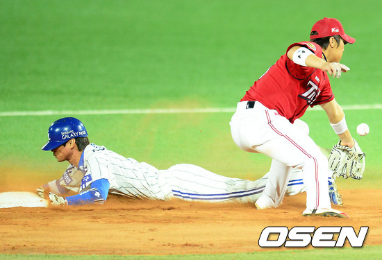 15일 오후 대구구장에서 열린 '2012 팔도 프로야구' 삼성 라이온즈와 KIA 타이거즈의 경기에서 7회말 무사 주자 1루 삼성 신명철 타석에서 1루 주자 강명구가 2루 도루에 성공하고 있다.
