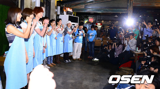 15일 오후 서울 압구정 한 포차에서 진행된 영화 '코리아' 일일포차에서 출연배우들포즈과 문현성 감독이 취하고 있다
