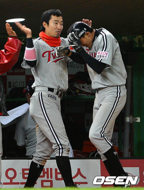 15일 오후 인천야구장에서 열린 '2012 팔도 프로야구' SK 와이번스와 LG 트윈스와의 경기, 9회초 무사 1루 LG 서동욱의 역전 1타점 적시 3루타 때 홈을 밟은 1루주자 김용의가 정성훈에게 축하를 받고 있다.