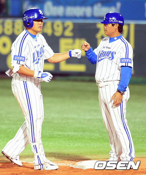 15일 오후 대구구장에서 열린 '2012 팔도 프로야구' 삼성 라이온즈와 KIA 타이거즈의 경기에서 7회말 2사 주자 1,3루 삼성 박한이가 즁견수 앞 1타점 적시타를 날린 후 1루에서 김태균 코치와 하이파이브를 하고 있다.