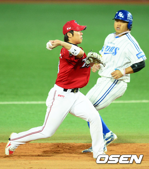 15일 오후 대구구장에서 열린 '2012 팔도 프로야구' 삼성 라이온즈와 KIA 타이거즈의 경기에서 8회말 무사 주자 1루 삼성 정형식의 3루수 앞 병살타때 KIA 2루수 안치홍이 1루 주자 박석민을 2루에서 포스아웃 시킨 후 1루로 송구하고 있다.