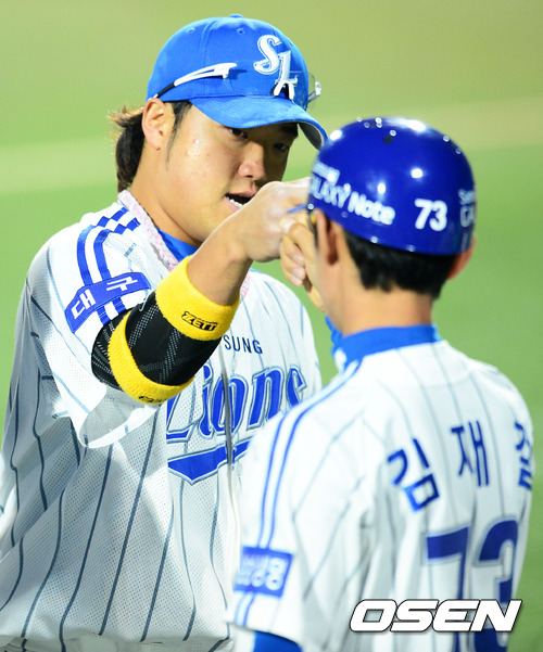 경기를 마치고 삼성 박석민이 김재걸 코치와 하이파이브를 하고 있다. / rumi@osen.co.kr