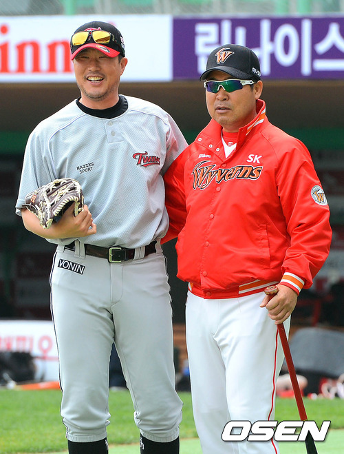 16일 오후 인천야구장에서 열린 '2012 팔도 프로야구' SK 와이번스와 LG 트윈스와의 경기에 앞서 LG 최동수와 SK 이만수 감독이 인사를 하고 있다.