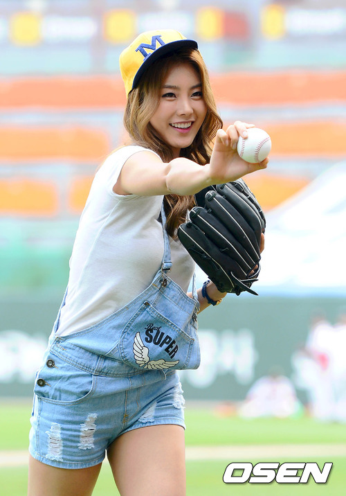 16일 오후 인천야구장에서 열린 '2012 팔도 프로야구' SK 와이번스와 LG 트윈스와의 경기에 앞서 그룹 '위'의 로지가 한 방송 프로그램 촬영을 위해 투구 연습을 하고 있다.