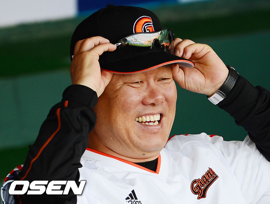 16일 오후 사직구장에서 '2012 팔도 프로야구' 롯데 자이언츠와 넥센 히어로즈와의 경기가 열릴 예정인 가운데 훈련 시간에 롯데 양승호 감독이 덕아웃에서 환하게 미소짓고 있다.