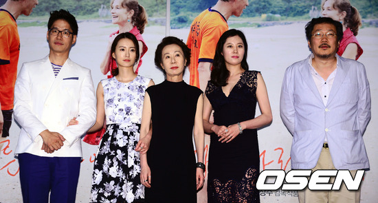 16일 오후 건대 롯데시네마에서 진행된 영화 '다른 나라에서'(홍상수 감독) 언론배급시사회에서 유준상 정유미 윤여정 문소리 홍상수감독이 포토타임을 갖고 있다.