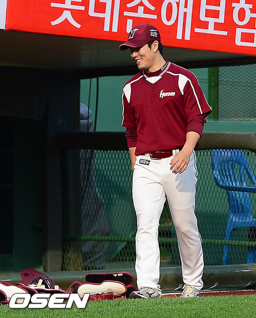 16일 오후 사직구장에서 '2012 팔도 프로야구' 롯데 자이언츠와 넥센 히어로즈와의 경기가 열릴 예정인 가운데 넥센 김병현이 훈련을 마치고 덕아웃으로 향할때 팬들이 환호성을 지르자 김병현이 미소짓고 있다.