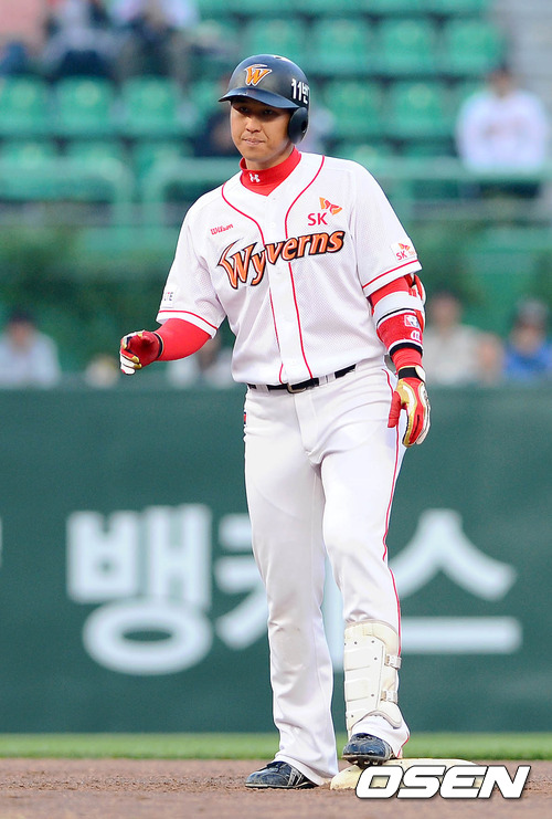 16일 오후 인천야구장에서 열린 '2012 팔도 프로야구' SK 와이번스와 LG 트윈스와의 경기, 1회말 1사 1루 SK 최정이 선제 중전 1타점 적시타를 치고 타임을 외치고 있다.