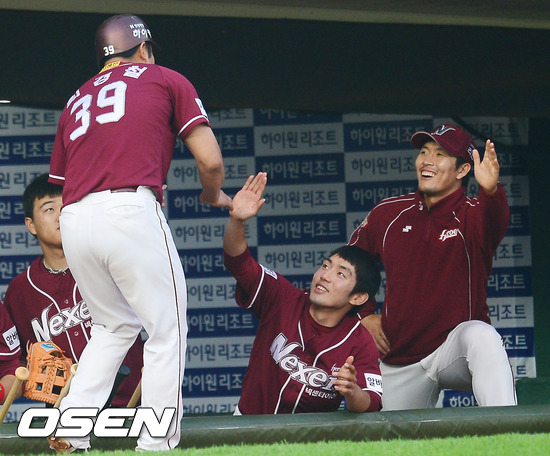 16일 오후 사직구장에서 열린 '2012 팔도 프로야구' 롯데 자이언츠와 넥센 히어로즈와의 경기에서 2회초 1사 주자 2,3루 넥센 정수성의 우익수 앞 1타점 적시타때 홈을 밟은 최경철이 덕아웃에서 기쁨을 나눌때 김병현이 환하게 웃고 있다.