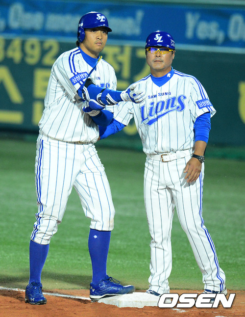 16일 오후 대구구장에서 열린 '2012 팔도 프로야구' 삼성 라이온즈와 KIA 타이거즈의 경기, 3회말 1사 만루에서 삼성 채태인이 역전 2타점 적시타를 날리고 김태균 코치와 하이파이브를 하고 있다.
