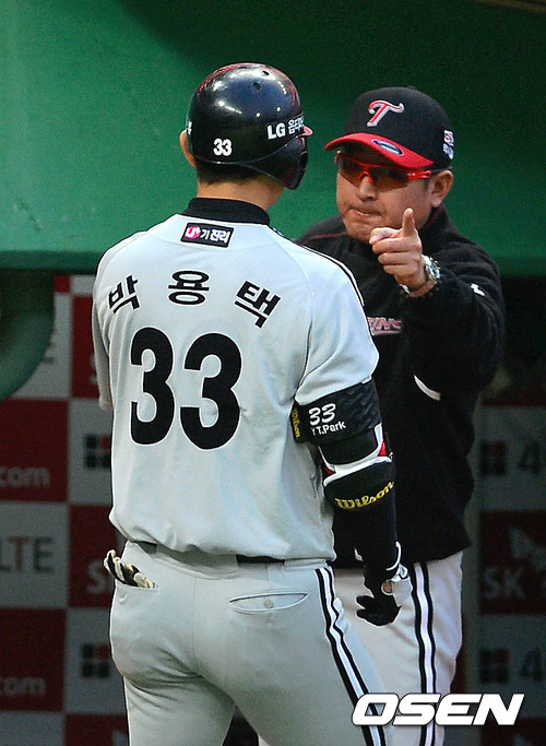 16일 오후 인천야구장에서 열린 '2012 팔도 프로야구' SK 와이번스와 LG 트윈스와의 경기, 3회초 2사 LG 박용택이 우월 솔로 홈런을 치고 더그아웃에서 김기태 감독의 축하를 받고 있다.