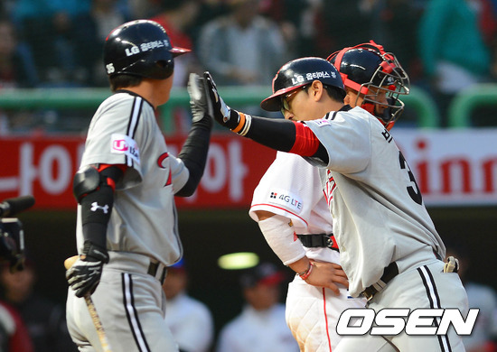 16일 오후 인천야구장에서 열린 '2012 팔도 프로야구' SK 와이번스와 LG 트윈스와의 경기, 3회초 2사 LG 박용택이 우월 솔로 홈런을 치고 홈에서 이진영과 하이파이브를 하고 있다.