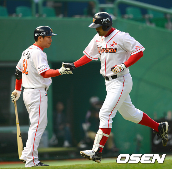 16일 오후 인천야구장에서 열린 '2012 팔도 프로야구' SK 와이번스와 LG 트윈스와의 경기, 3회말 무사 SK 이호준이 좌월 솔로 홈런을 치고 홈에서 박재홍과 하이파이브를 하고 있다.