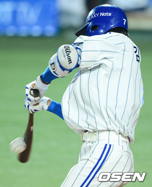 16일 오후 대구구장에서 열린 '2012 팔도 프로야구' 삼성 라이온즈와 KIA 타이거즈의 경기, 3회말 2사 만루에서 삼성 김상수가 내야땅볼 타구를 날리고 있다.