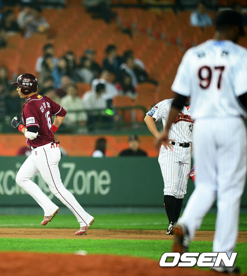 16일 오후 사직구장에서 열린 '2012 팔도 프로야구' 롯데 자이언츠와 넥센 히어로즈와의 경기에서 6회초 1사 주자 1루 홈런 레이스 선두 넥센 강정호가 좌월 투런 홈런을 날린 후 그라운드를 돌고 있다. 이번 시즌 12호 홈런으로 3경기 연속 홈런이다.