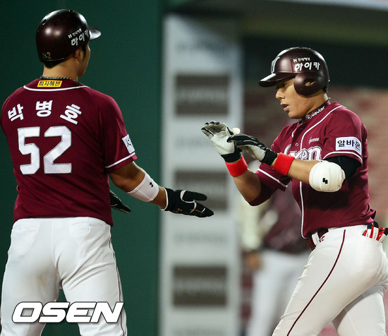 16일 오후 사직구장에서 열린 '2012 팔도 프로야구' 롯데 자이언츠와 넥센 히어로즈와의 경기에서 6회초 1사 주자 1루 홈런 레이스 선두 넥센 강정호가 좌월 투런 홈런을 날린 후 홈에서 박병호와 하이파이브를 하고 있다.
