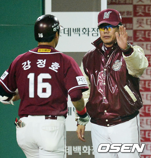 16일 오후 사직구장에서 열린 '2012 팔도 프로야구' 롯데 자이언츠와 넥센 히어로즈와의 경기에서 6회초 1사 주자 1루 홈런 레이스 선두 넥센 강정호가 좌월 투런 홈런을 날린 후 덕아웃에서 김시진 감독과 하이파이브를 하고 있다.
