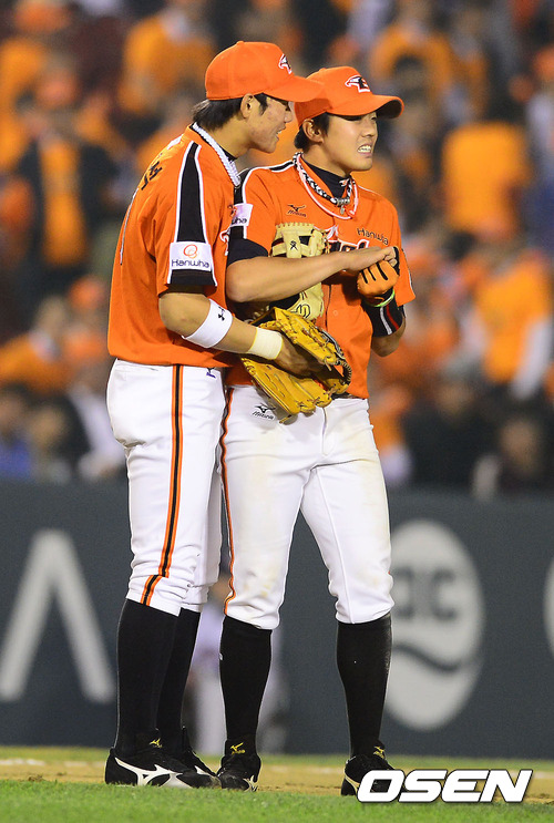 16일 오후 서울 잠실구장에서 열리는 2012 팔도 프로야구 두산 베어스와 한화 이글스의 경기 6회말 1사 1,2루 두산 임재철의 내야땅볼을 한화 오선진 3루수가 1루로 송구했으나 실책했다. 하석주가 오선진을 격려하고 있다.