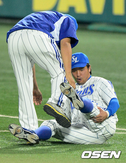 16일 오후 대구구장에서 열린 '2012 팔도 프로야구' 삼성 라이온즈와 KIA 타이거즈의 경기, 5회초 2사 3루에서 삼성 채태인이 KIA 최희섭의 타구를 처리하고 다리 부상으로 괴로운 표정을 짓고 있다.