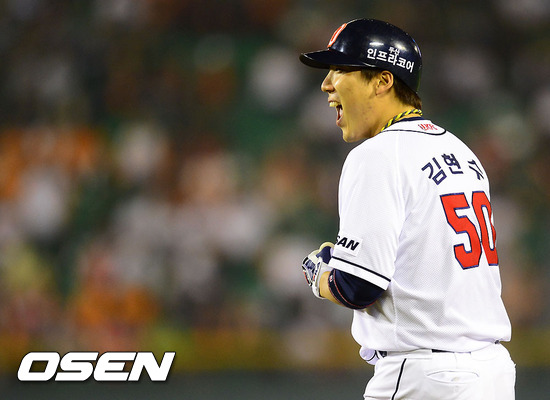 16일 오후 서울 잠실구장에서 열리는 2012 팔도 프로야구 두산 베어스와 한화 이글스의 경기 6회말 2사 2루 두산 김현수가 동점 적시타를 날린 후 환호하고 있다.