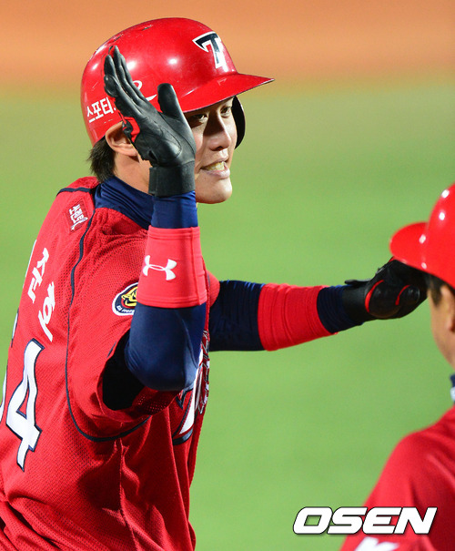 16일 오후 대구구장에서 열린 '2012 팔도 프로야구' 삼성 라이온즈와 KIA 타이거즈의 경기, 6회초 무사 1,2루에서 KIA 이준호가 역전 2타점 적시 3루타를 날리고 기뻐하고 있다