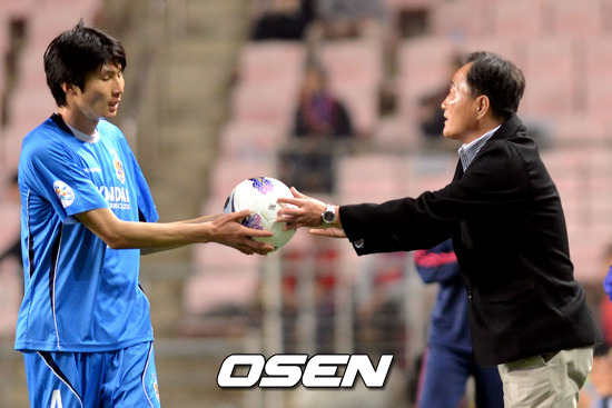 16일 오후 울산 문수 월드컵경기장에서 열린 아시아축구연맹(AFC) 챔피언스리그 F조 6차전 울산 현대와 FC 도쿄의 경기 후반 울산 김호곤 감독이 사이드라인 아웃된 볼을 강민수에게 전달해주고 있다.