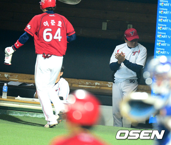 16일 오후 대구구장에서 열린 '2012 팔도 프로야구' 삼성 라이온즈와 KIA 타이거즈의 경기, 6회초 무사 1,2루에서 역전 적시타를 날린 KIA 이준호가 무사 3루에서 폭투를 틈파 홈을 밟자 선동렬 감독이 박수를 치고 있다.