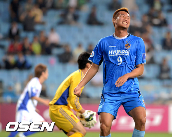 16일 오후 울산 문수 월드컵경기장에서 열린 아시아축구연맹(AFC) 챔피언스리그 F조 6차전 울산 현대와 FC 도쿄의 경기 후반 울산 김신욱이 찬스를 살리지 못해 허탈한 웃음을 짓고 있다.
